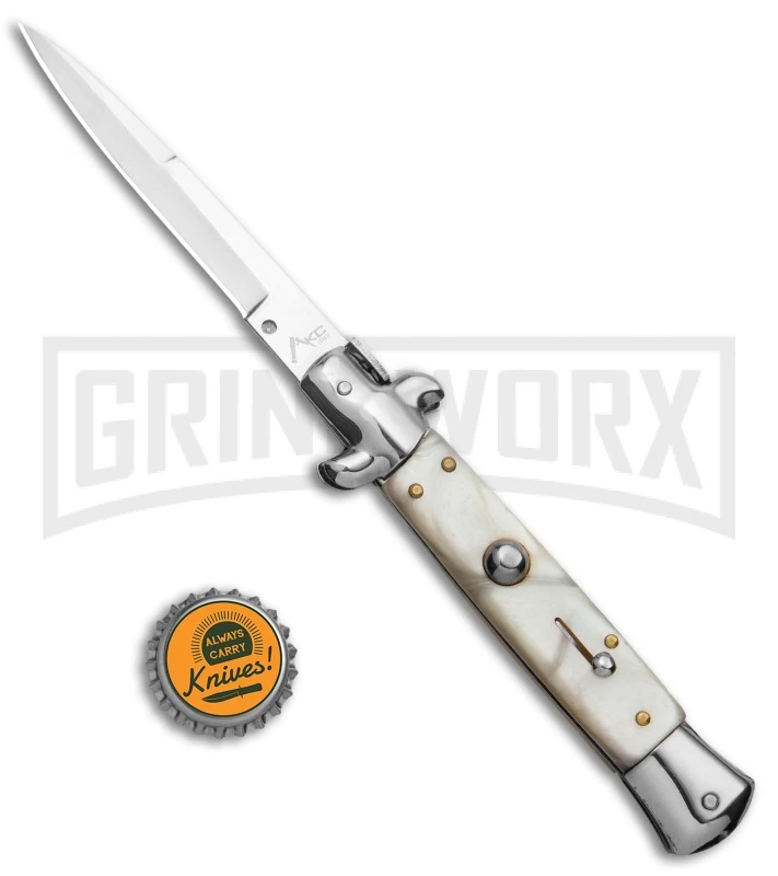 This 9″ Italian-Style stiletto features white acrylic scales and a bayonet blade.