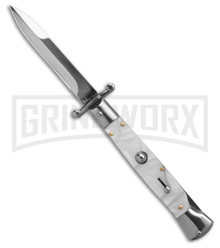 This blade boasts white pearlex scales over stainless steel frames and liners.