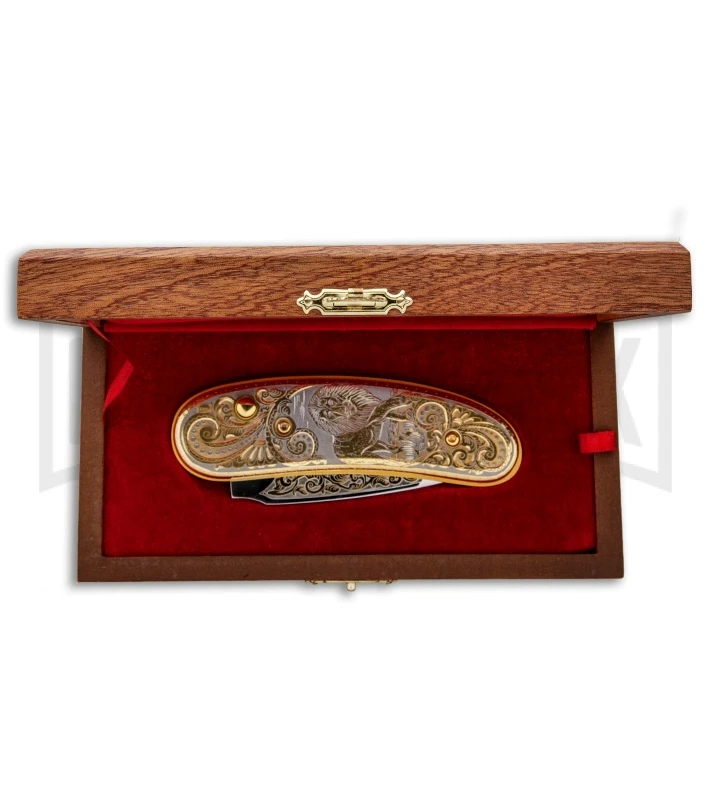 This Custom Russian Lion Automatic Knife features a real gold plated handle with impressive laser engraved lion. The blade has a high polish finish and also has laser engraving on the flats. It has a strong coil spring that makes the knife open as fast and as hard as a lion strike. Comes with an elegant wood box that is velvet lined to showcase this knife and a leather sheath for convenient belt carry.