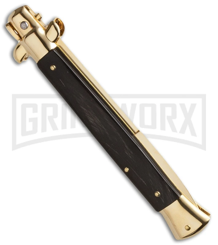 Large and classy Frank Beltrame stiletto with a gold finished stainless steel bayonet blade and bolsters. It has a genuine dark horn handle with standard stainless push button and sliding safety. This Italian knife is sure to draw attention in your collection.