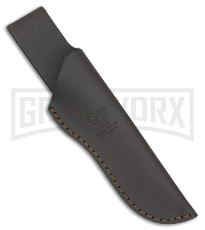 The Frost Cutlery Hen & Rooster Rammed Bowie is a fixed blade knife for hunting. The full tang stainless steel, spey blade has a satin finish. The handle is made of Ram’s horn and features a lanyard hole. It comes with a brown leather belt sheath.