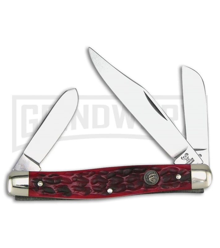 The Frost Cutlery Hen & Rooster Stockman is a traditional pocket knife for everyday carry. The stainless steel, clip point, sheepsfoot, and spey blades have mirror finishes and nail nick openers. The handle is made of red pick bone with nickel silver bolsters and an inlay shield. It has, like most traditional pocket knives, a slip joint.