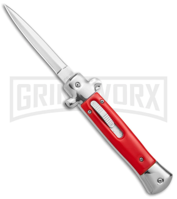 This Mago OTF model features satin-finished bolsters and a satin dagger blade and a red acrylic handle with nickel silver bolsters.