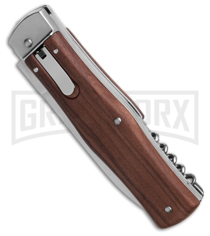 This Mikov Predator Multi-Tool has a satin dagger blade, a wood handle, a pocket clip, and an additional can opener, bottle opener (with flat head screwdriver), and cork screw.