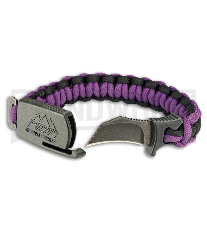 The Outdoor Edge Para Claw is a paracord bracelet that features a small, hidden knife in the clasp. The Para Claw features a black stonewash finished, 8Cr13MoV, hawkbill blade. The bracelet that doubles as the handle is made of purple paracord. The blade is molded into a GRN guard that ties into the bracelet. This bracelet fits 5.75″-6.5″.