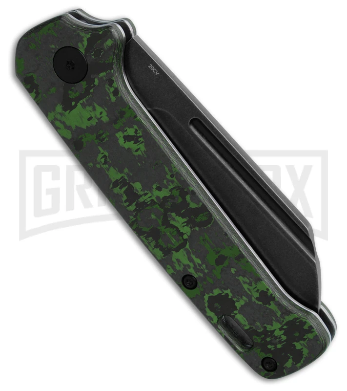 This knife has a black and white Fat Carbon handle and a black stonewash sheepsfoot blade.