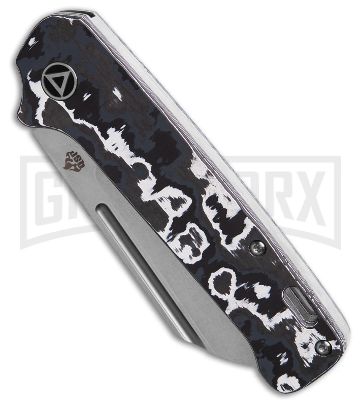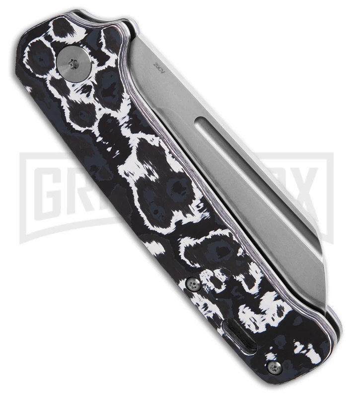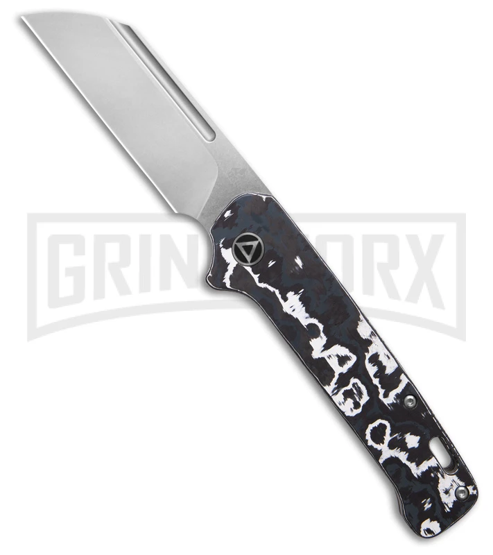 This knife has a black and white Fat Carbon handle and a stonewash sheepsfoot blade.