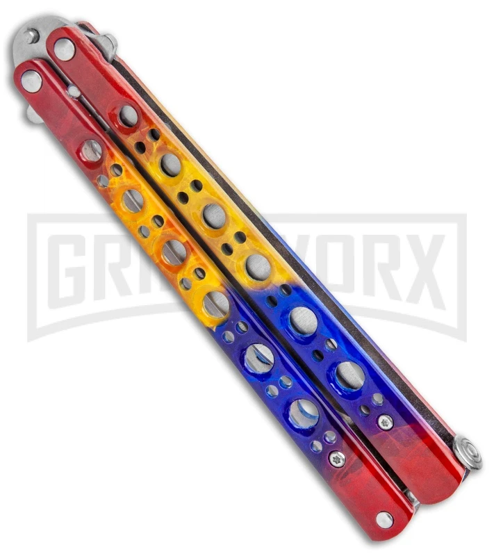 This Butterfly Knife is designed with a drop point blade, satin finish, and a single spring loaded tang pin. This knife features a blue/yellow/red stainless steel handle that has a skeletonized design to reduce weight. This is a great butterfly knife at a price that won’t put a huge dent in your wallet.