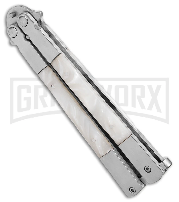 This Regal Flipper balisong has white pearlescent inlays and a satin blade.