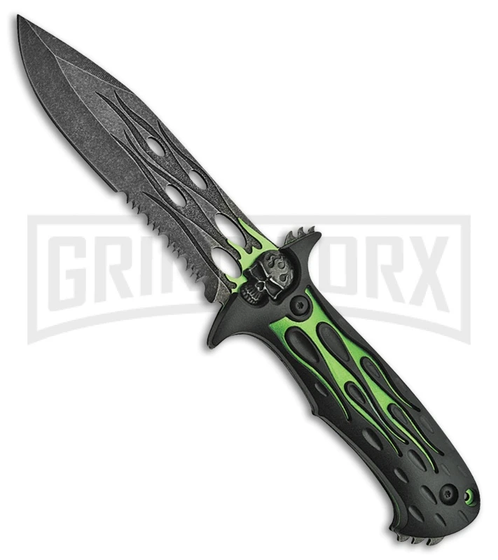 The Rite Edge Dead Walker is a fixed blade knife that can fuel your zombie hate with the lavish green flame design etch and slot cutouts. The stainless steel, spear point blade has a black stonewash finish and is partially serrated. The black, polymer handle has lime green flame trim and a skull shield. This also includes a lanyard hole and black nylon belt sheath with a embroidered lime green flame design.