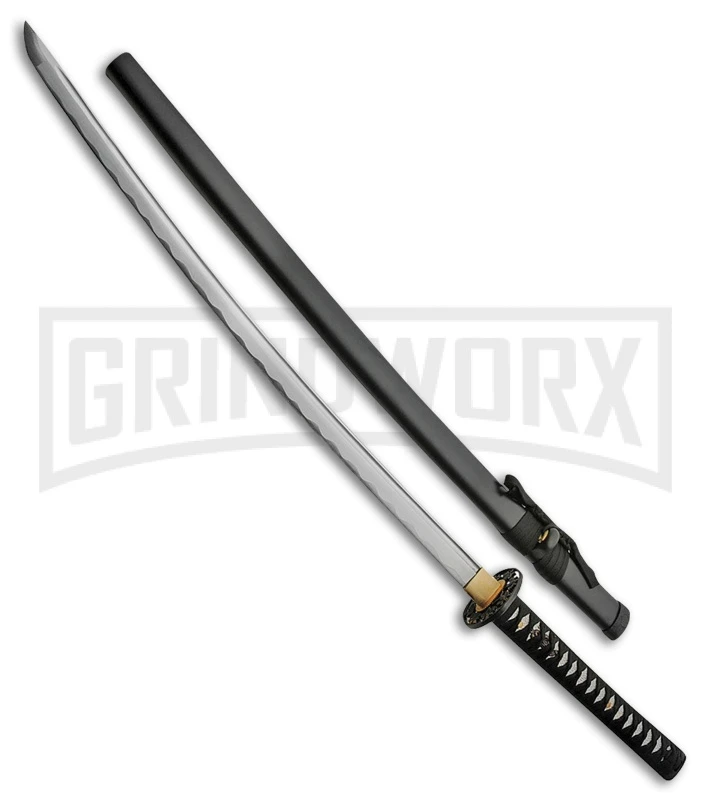 The Rite Edge Flower is a sword for adding to your collection or using to fight the undead. The stainless steel blade has a satin finish. The white handle is wrapped in black cord and features a brass blade collar and a circular metal tsuba with a flower design. It comes with a black wood scabbard.