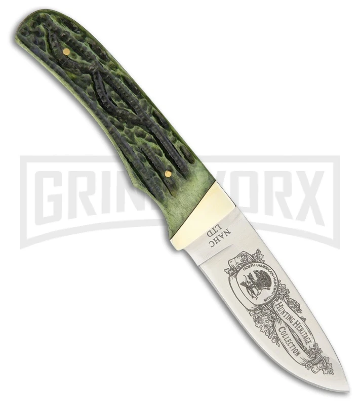The Rite Edge Hunting Heritage Club is a small, fixed blade knife perfect for hunters. This knife features a mirror finished, stainless steel, drop point blade with Hunting Heritage Club artwork on the blade. The handle is made of green jigged ram’s horn with a nickel silver bolster. Carry and attach using the brown leather belt sheath.