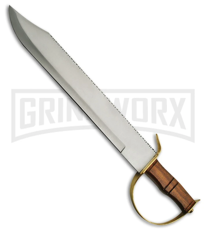 The Rite Edge Notch is a decorative or novelty sword with a real cutting edge and intricate detail. The Notch features a satin finished, stainless steel, clip point blade. The handle is made of brown wood with a brass D-guard. Carry and attach using the black leather belt sheath.