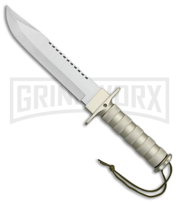 The Rite-Edge Strive CN210895SL is a fixed blade knife that will help you survive in any element. The gray, aluminum handle has hidden storage that includes a compass and survival kit. The stainless steel, clip point blade has a satin finish and a saw back. This also has a lanyard and black nylon belt sheath.