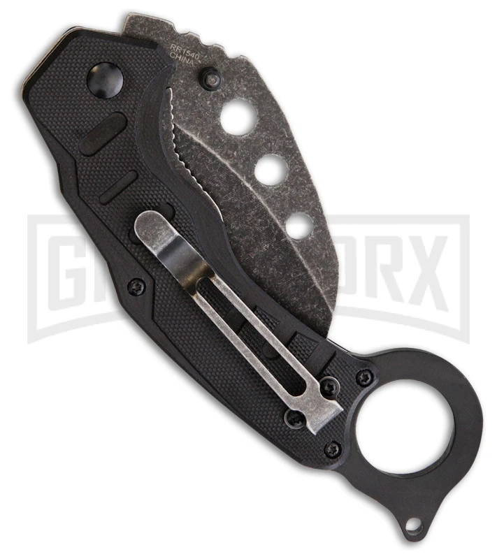 The Rough Rider Cover is a spring assisted tactical knife, for the stealthy. The Cover features a black stonewash finished, stainless steel, karambit blade with thumb stud and thumb ridge openers. The liner lock handle is made from black G-10 with a finger ring and glass breaker end.