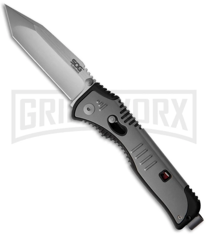 The Flashback has the distinction of being the fastest assisted opening blade available. Satin finished AUS-8 stainless steel tanto blade with thumb stud opener. Includes locking safety and reversible pocket clip, making it an ideal knife for everyday carry. SOG Knives.