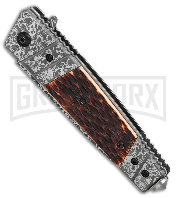This Tac-Force spring assisted knife makes it possible to own the collectible quality of a damascus at a fraction of the cost. It has a damascus etched graphic on the handle, blade and bolsters with jigged bone handle inlays for a classic fit and finish. With impressive details like this no one would ever guess that you spent less than 15 dollars. It features a spring assisted blade, stainless steel pocket clip, and a glass breaker pommel.