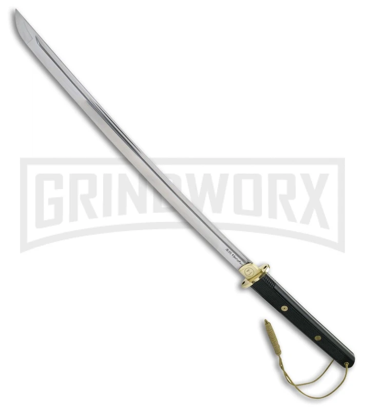 The United Cutlery Honshu Wakizashi is a long, tactical katana style sword. The Honshu Wakizashi features a mirror polished, high carbon steel blade with a deep blood groove and Honshu etching. The handle is made of black, checkered ABS with a brass hand guard and dual lashing holes. The scabbard is made of black wood and polycarbonate with matching paracord wrap and brass fittings. Also includes a black storage sleeve.
