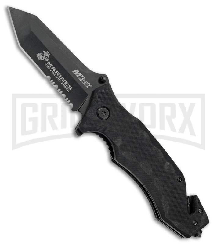 The USMC Marines SGT is a spring assisted knife for rescue situations. The stainless steel, tanto blade has a black finish, a partially serrated edge, and thumb stud and flipper openers. The handle is made of black G-10 that features a glass breaker, seat belt cutter, and a liner lock mechanism. It comes with a stainless steel pocket clip.
