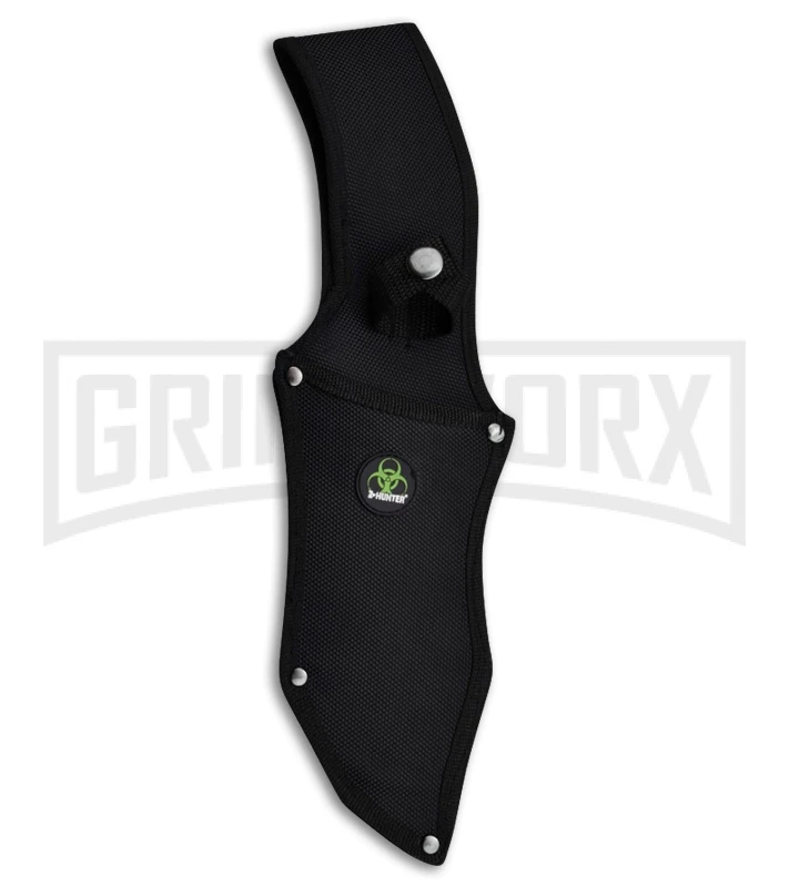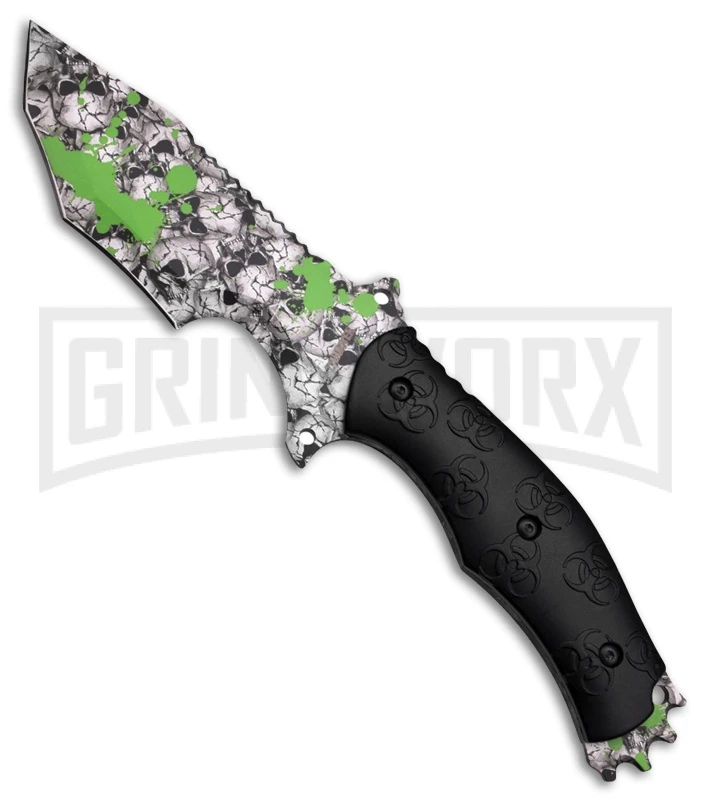 The Z-Hunter The Fallen is a fixed blade knife that is an excellent choice for fighting the undead. The modified tanto, stainless steel blade has a, white and black skull camo with green splatter, finish. The handle is made of black aluminum with embossed bio-hazard logos built over an extended tang construction. It has a lanyard hole and comes with a black nylon 168D belt sheath.